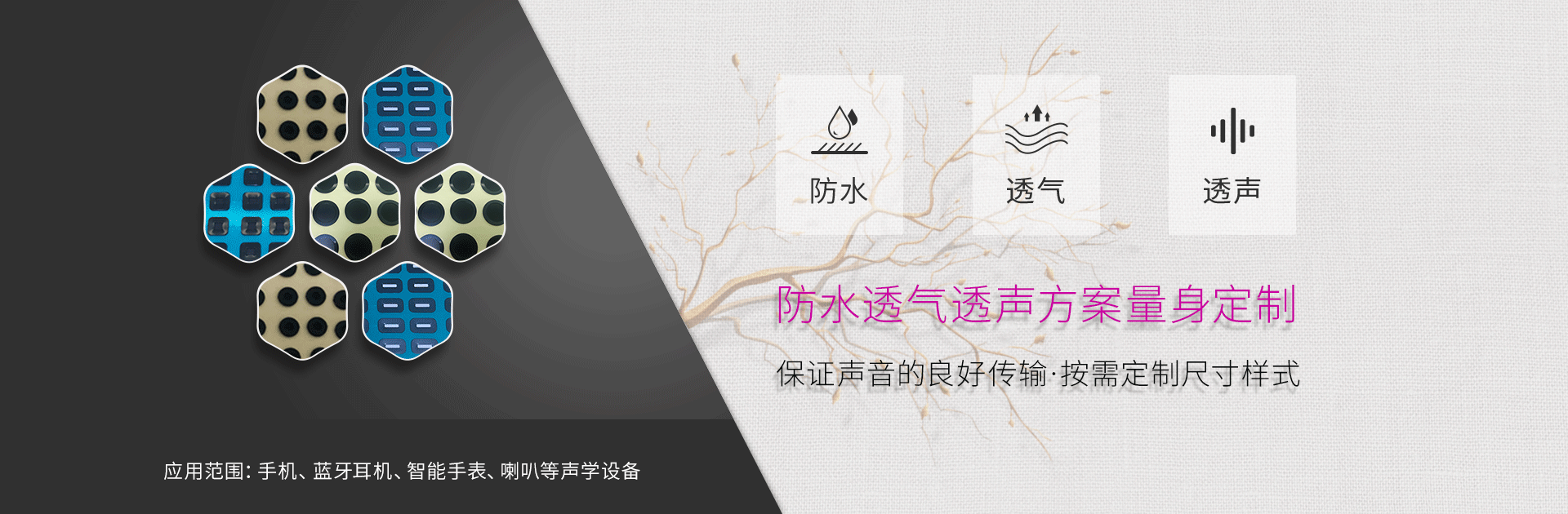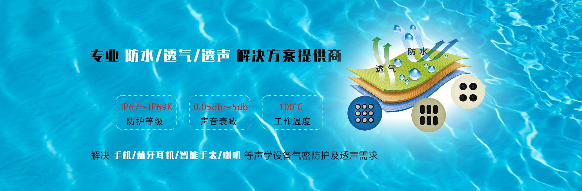 成立于2012年1月,我司自主研發生產及銷售:防水透聲膜,防水透氣膜,防水網,產品能夠提供高達IP54- IP57- IP67 - IP68的防護等級,在保證音質的同時,提供更好的防水-防塵-防油污性能,具有穩定的透氣性,耐高溫,抗老化,適度的柔軟性....